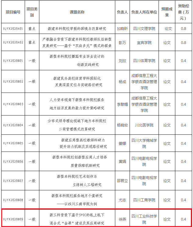 2020年9月7日,四川省教育厅新建院校与改革发展研究中心公布了“2020年度四川省高校人文社科重点研究基地科研项目的通知”。我院教师徐燕申报的课题新工科背景下基于SPOC的线上线下混合式“金课”建设及其应用研究(项目编号:XJYX2020B09)喜获立项。