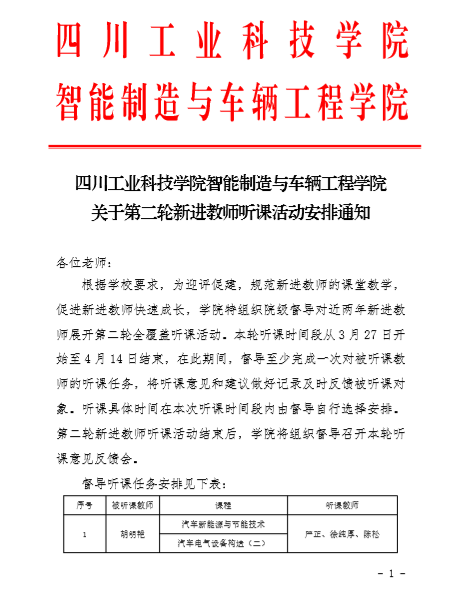 智能制造与车辆工程学院 关于第二轮新进教师听课活动安排通知