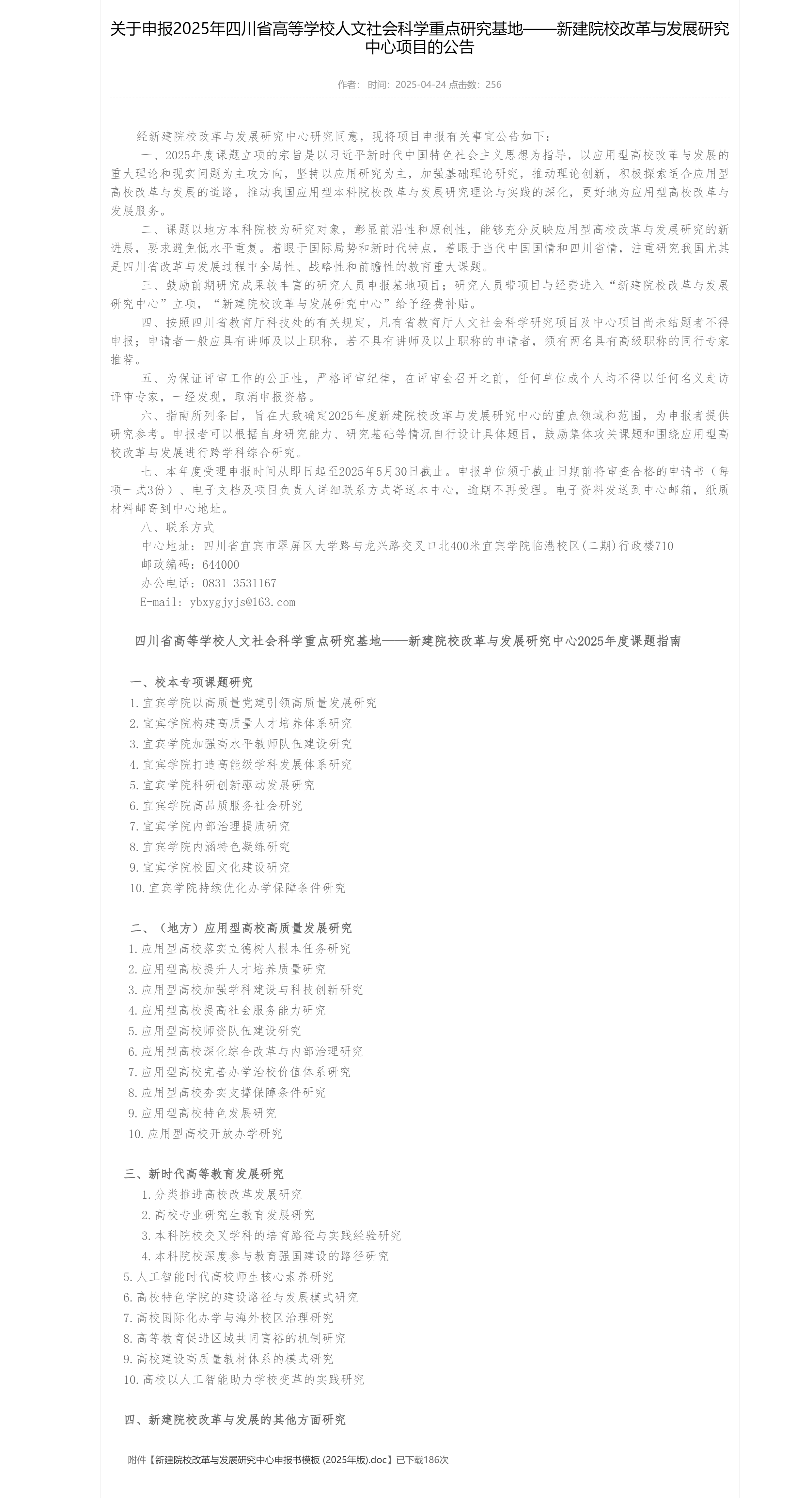 近日,宜宾学院高等教育研究所发布了《关于申报2025年四川省高等学校人文社会科学重点研究基地——新建院校改革与发展研究中心项目的公告》(以下简称“公告”)。现将有关事宜通知如下: