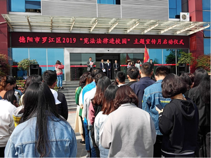 本次启动仪式,是深化“法律进学校”的重要举措,是夯实法治德阳根基的具体行动。仪式开始,校长张小南讲话中提到努力弘扬宪法精神,促进宪法法律进校园,要提高在校学生的法律素养,培育学生的法治信仰,增强法治观念。议程第二项,罗江区政府副区长、区公安分局局长陈易为法律服务志愿队授旗。议程第三项,德阳市司法局党委委员、市司法局经开区分局局长李玉龙讲话并宣布“宪法法律进校园”活动正式启动。李玉龙讲话中强调,近年来,社会上发生不少针对在校学生的恶性侵害案件,同时,校内也发生了一些在校学生违法犯罪的案件,希望学校以及学生能够引起重视,