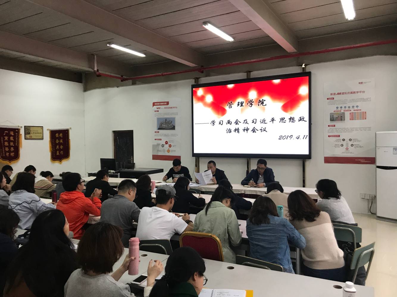 2019年4月11日下午,管理学院院长王进、副院长熊清明、教学办主任王波以及管理学院全体教师于ARE实训室顺利召开了学习两会及习近平思想政治精神会议。