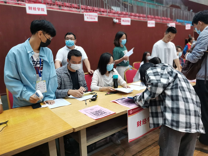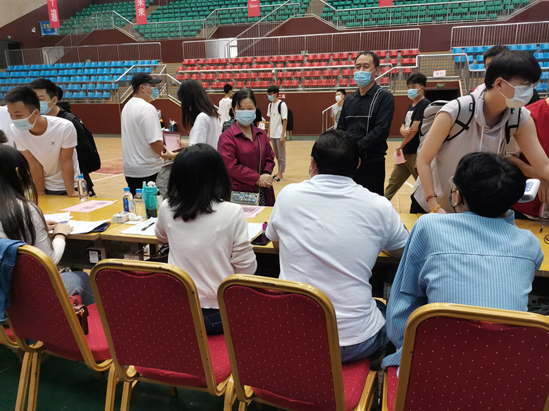 在迎新过程中,卢淑梅叮嘱迎新工作人员,一定要做好自我防护,每隔3小时要更换一个口罩、每隔一小时,用消毒液喷洒桌面,并及时用免洗洗手液洗手。同时她也叮嘱报到的新生,在此特殊时期,不要随意出校门,可以在校园里走走,熟悉校园环境,但是一定要戴好口罩。