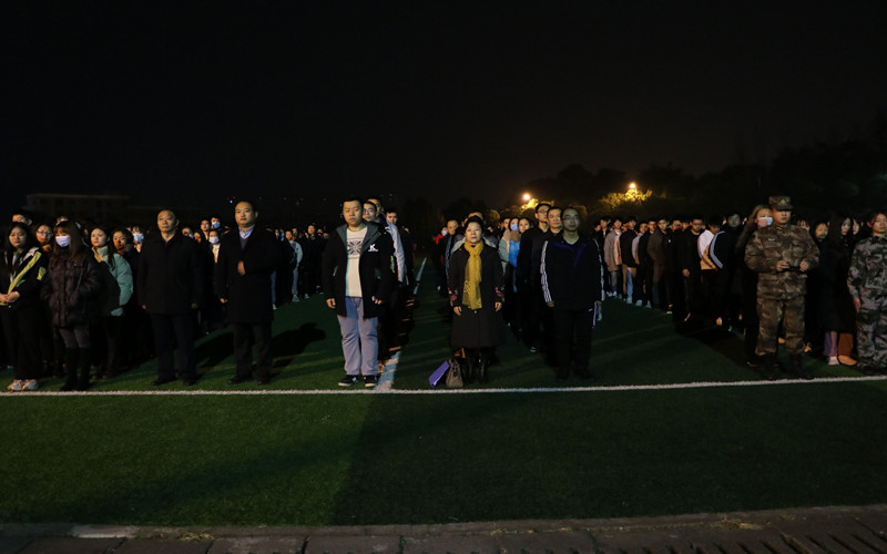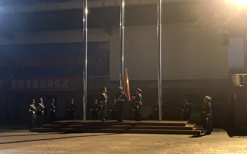 迎着冬日的晨曦,在全体师生的注目下,国旗队护送鲜艳的五星红旗进场,伴随着庄严的国歌,五星红旗冉冉升起。