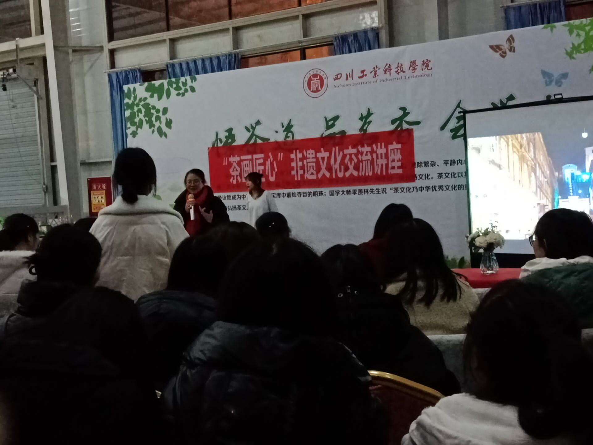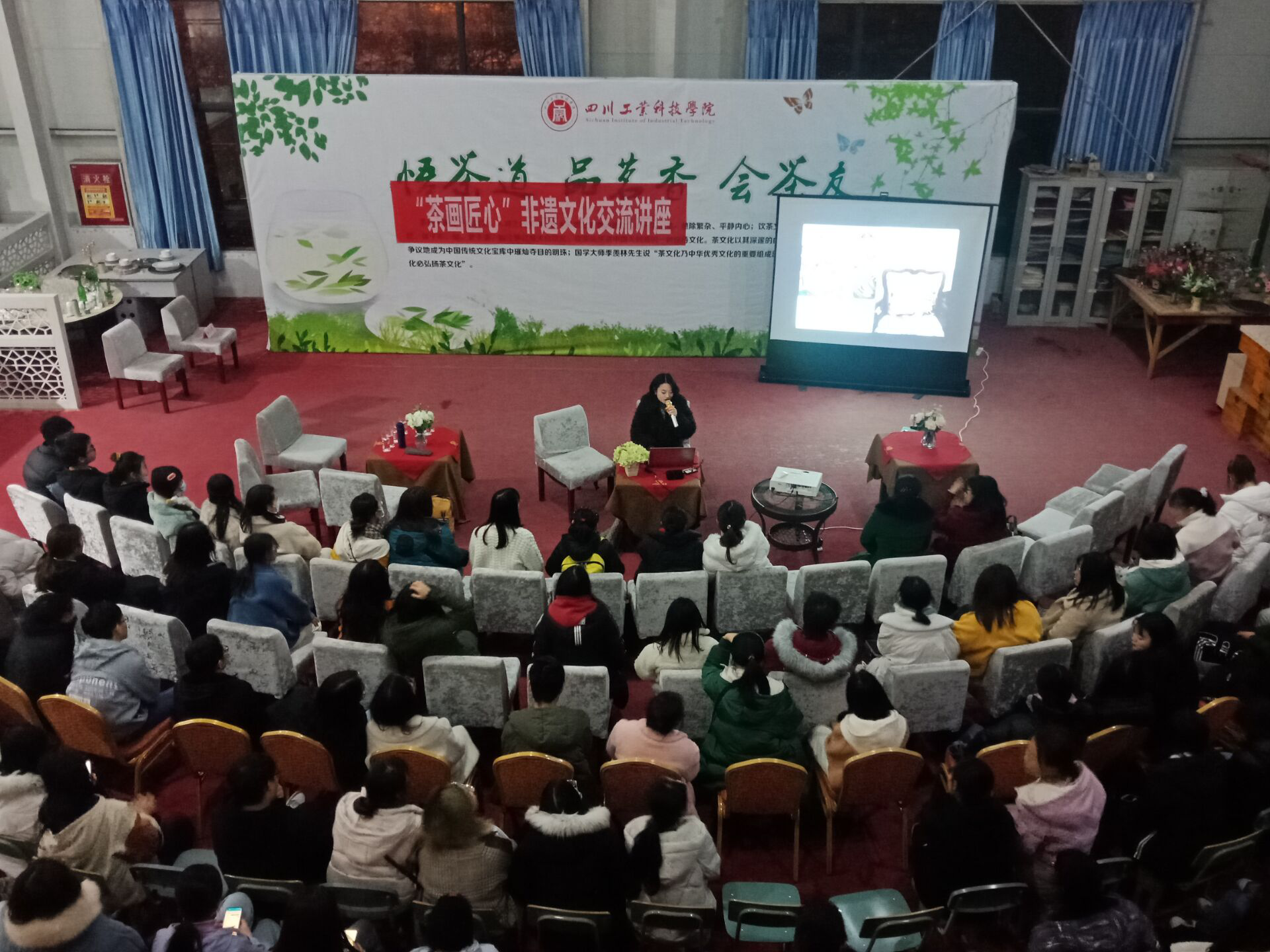 为深入挖掘中华优秀传统文化蕴含的丰富内涵,推动中华优秀传统文化创造性转化、创新性发展,丰富学院学生的传统文化内涵教育,活跃校园文化艺术氛围。2020年12月3日晚学院于西餐实训中心举行“茶画匠心”非遗文化交流讲座,管理学院近200名师生参加讲座。