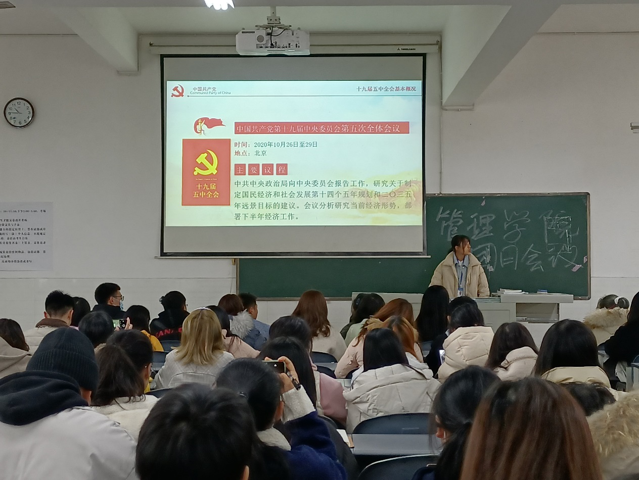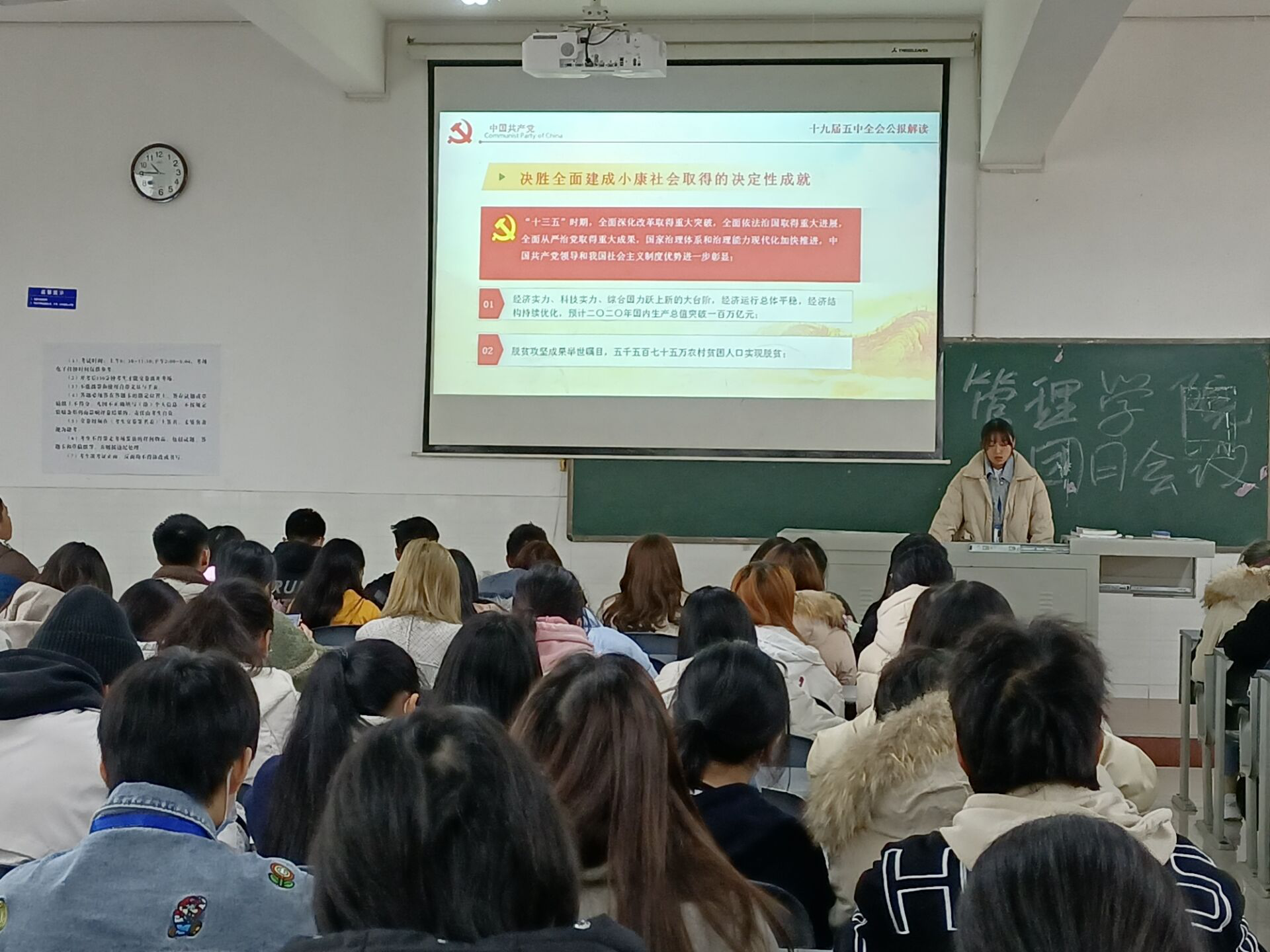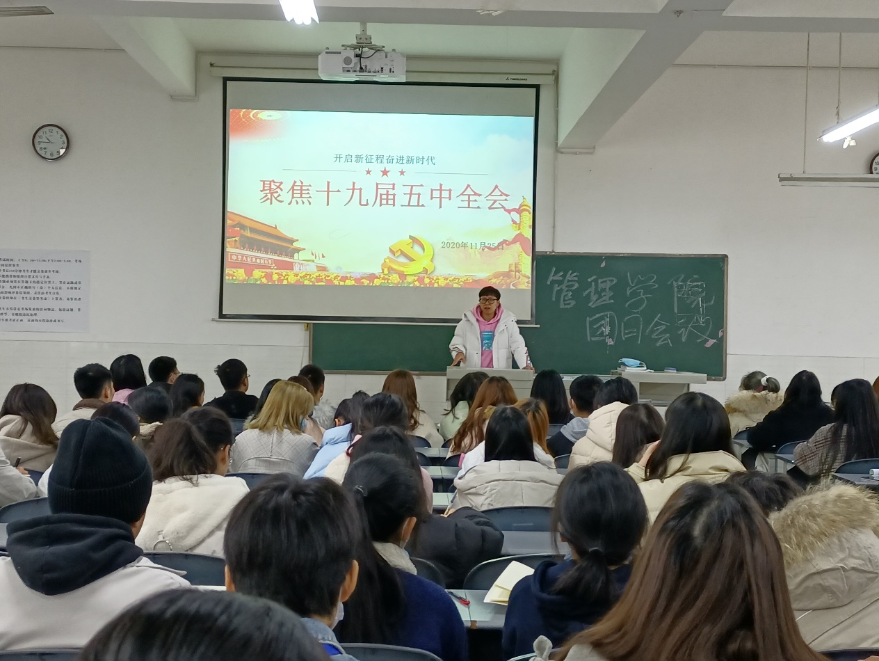2020年11月25日星期三,管理学院于毓秀104组织学习第十九届五中全会思想,大会由组织部副部长代玉玲主持,管理学院团总支书记邓卜豪、第30期入党积极分子及管理学院全体团支书参加。