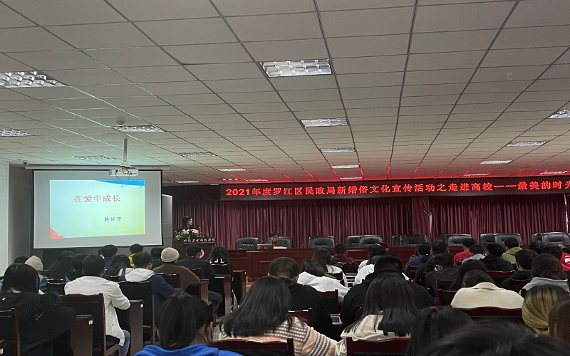 了提高青年学生对新婚俗文化的认识,10月20日,学校开展了罗江区民政局新婚俗文化宣传活动并开展了主题讲座--在爱中成长。讲座由罗江区民政局工作人员熊怀芳为主讲人,各班心理委员参加了此次讲座。