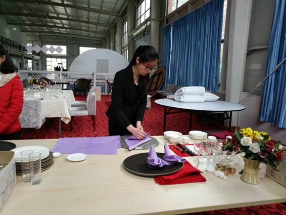 图为西餐项目参赛选手黄新芯同学在进行折花练习