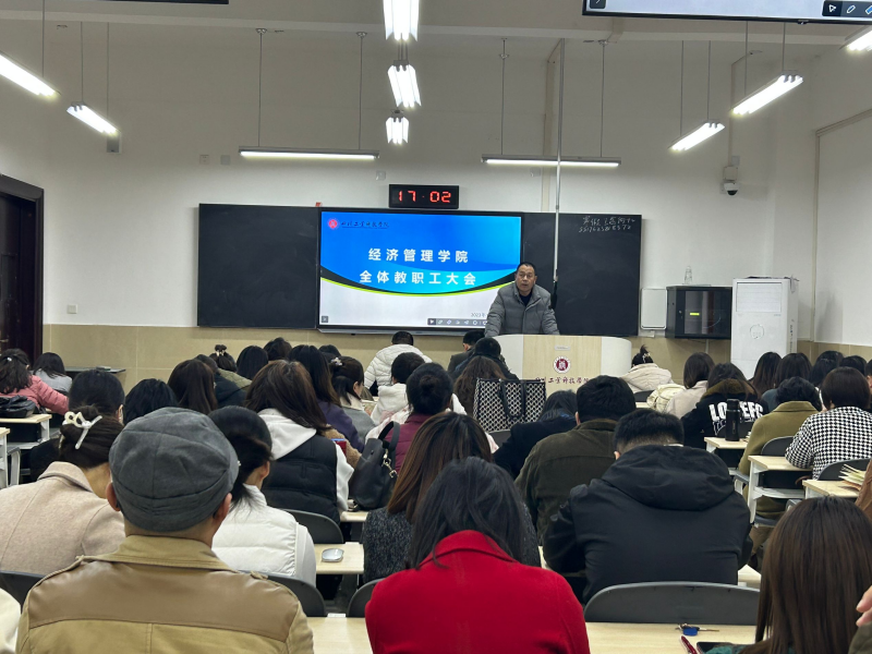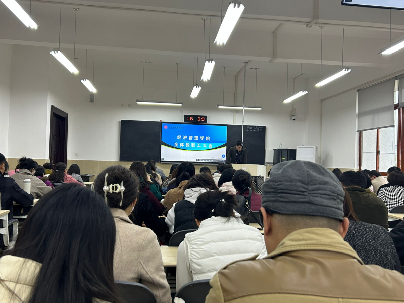 为提升教学质量, 部署学生论文工作及统筹期末考试安排。1130午,经济管理学校在龑江教学楼D305会议室召开12月份教学工作例会,学院党总支书记、院长王进主持会议并讲话。经济管理学院全体教师参加了会议。