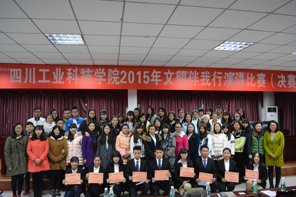 2015年11月29日晚7:00,由旅游学院承办的四川工业科技学院文明伴我行演讲比赛决赛在图书馆408会议室举行。支部副书记何林贵,学工干事李双晶老师,王娅老师,陈岚雪老师,司慧老师担任本次大赛的评委。