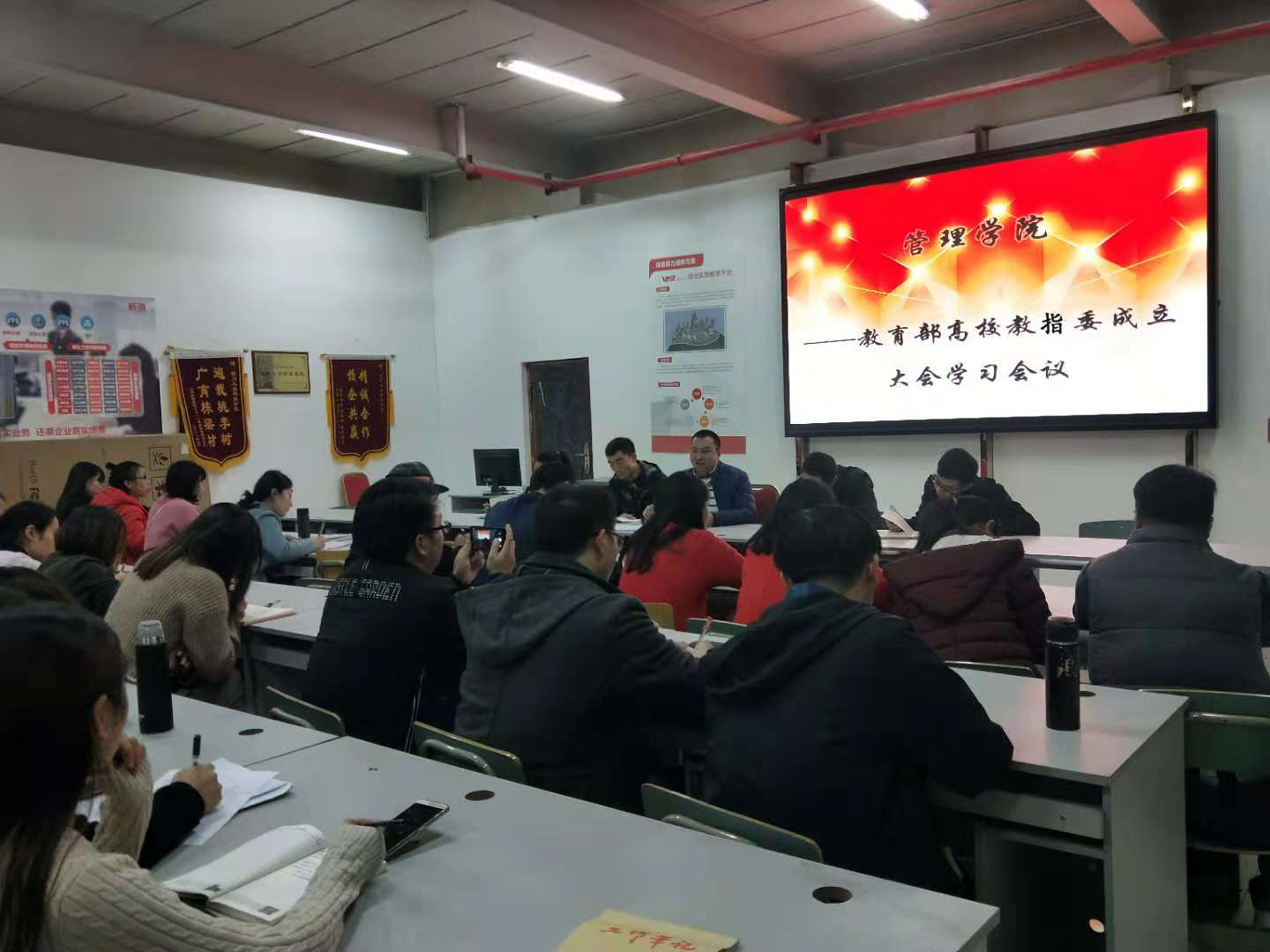 2018年11月13日,管理学院专题学习会议在实训室举行,传达学习2018—2022年教育部高等学校教学指导委员会(以下简称“教指委”)成立会议精神。管理学院全体院领导班子、全院教职工共39人参加了此次大会,大会由王进院长主持。
