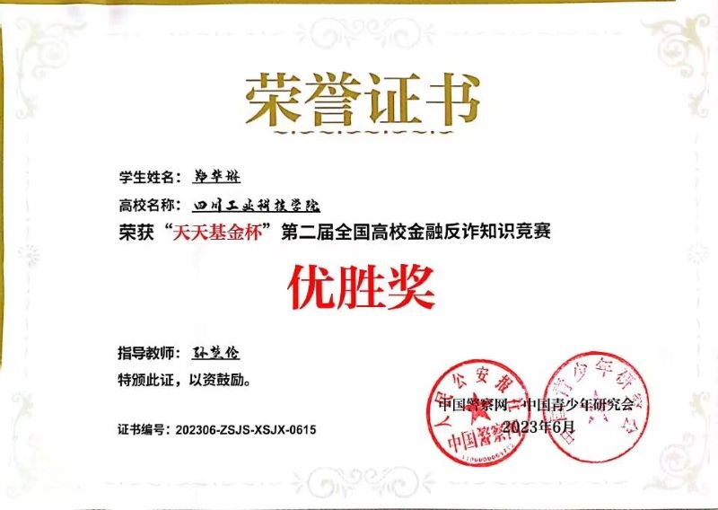 由中国警察网、中国青少年研究会举办的“天天基金杯”第二届全国高校金融反诈知识竞赛日前结束,我校荣获“优秀组织奖”,张言、周文雪、郑华琳、司思四位同学荣获优胜奖。