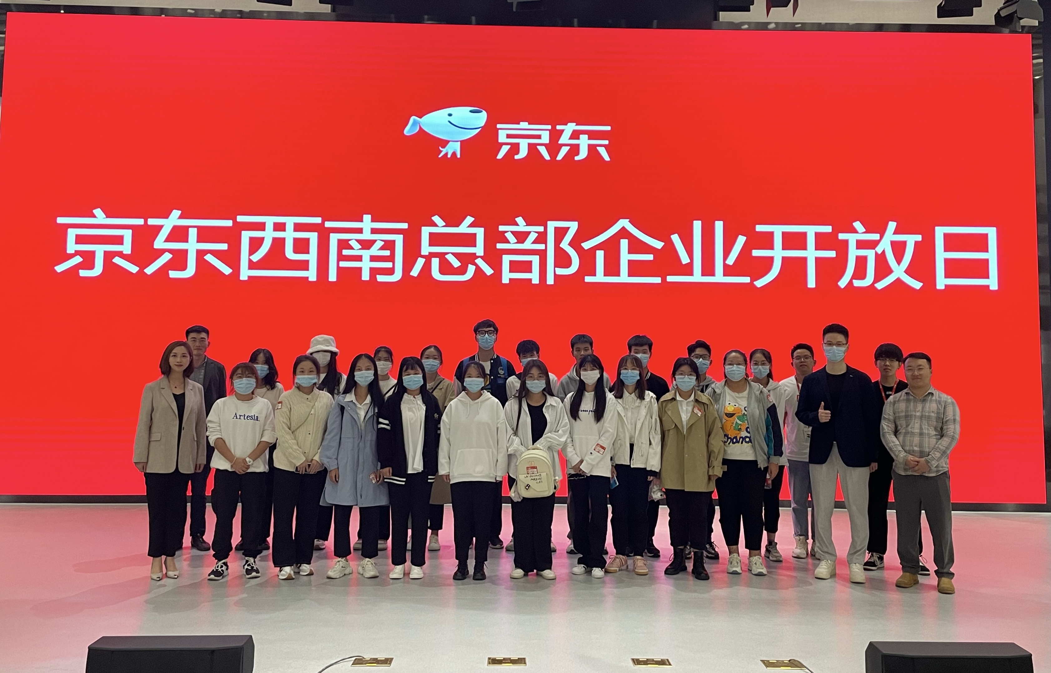2021年10月10日,管理学院因京东西南总部诚挚邀请,选派党总支副书记张东国、院长助理王波、实习实训干事刘雪娇,带领我院国际经济与贸易、物流管理、电子商务管理20余名自愿者参加“京东新职场实习实训交流”参观学习活动。