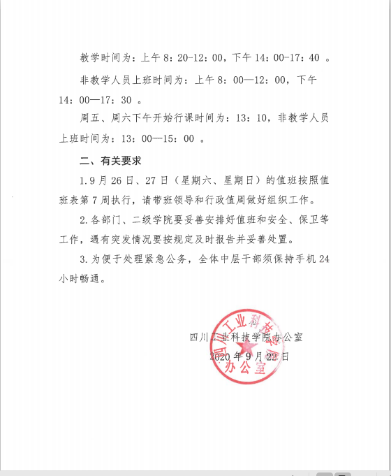 四川工业科技学院关于2020年中秋、国庆节放假安排的通知