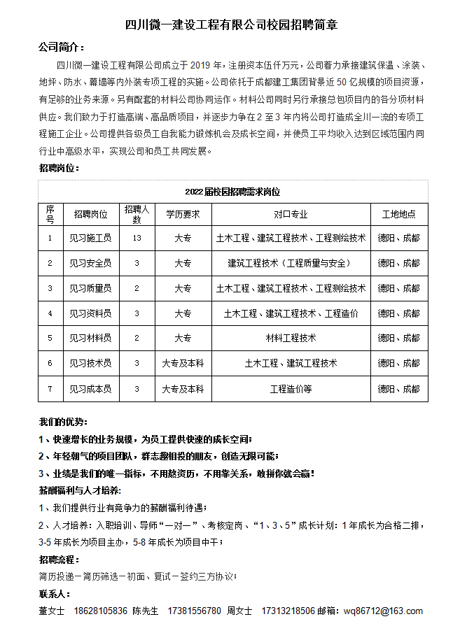 四川微一建设工程有限公司校园招聘简章