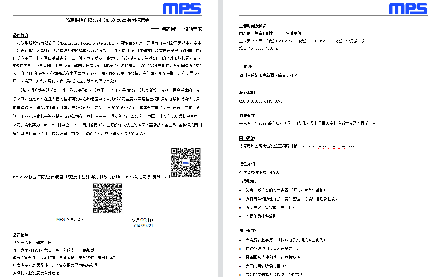 芯源系统有限公司(MPS)2022校园招聘简章