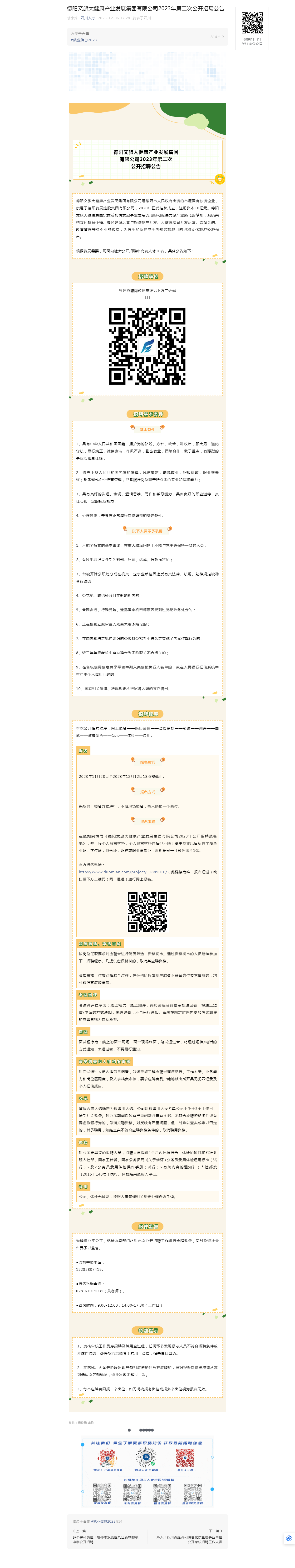 德阳文旅大健康产业发展集团有限公司2023年第二次公开招聘公告