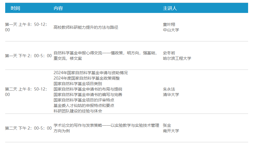 本次培训将围绕高校教师科研创新思维的培养、科研能力的提升、自然科学基金的申报与高水平学术论文的写作等主题展开,旨在通过相关内容的分享,帮助参训教师认知培养创新思维及提升科研能力的方法与路径,助力其提升基础科学研究水平;了解自然科学基金的申报流程及注意事项,掌握项目申报书的写作要点;学习自然科学学术论文的写作规范、选题创新、期刊选择、投稿注意事项等内容,助力其提升项目申报与论文写作水平。