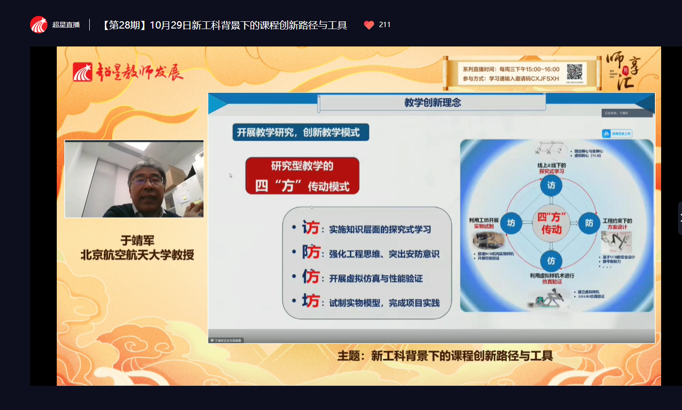 本期讲座特邀北京航空航天大学于靖军教授担任主讲。于靖军教授以“新工科背景下的课程创新路径与工具”为主题,结合新工科人才培养需求,系统分析了当前工程教育课程体系面临的挑战与机遇,全面阐述了课程创新的理念、方法与实施路径。他不仅分享了课程建设的前沿理论与研究成果,还介绍了一系列实用的创新教学工具与数字化资源平台,演示了如何将这些工具融入教学设计,有效激发学生学习兴趣,培养学生创新思维与实践能力,为新工科课程改革提供了重要参考。