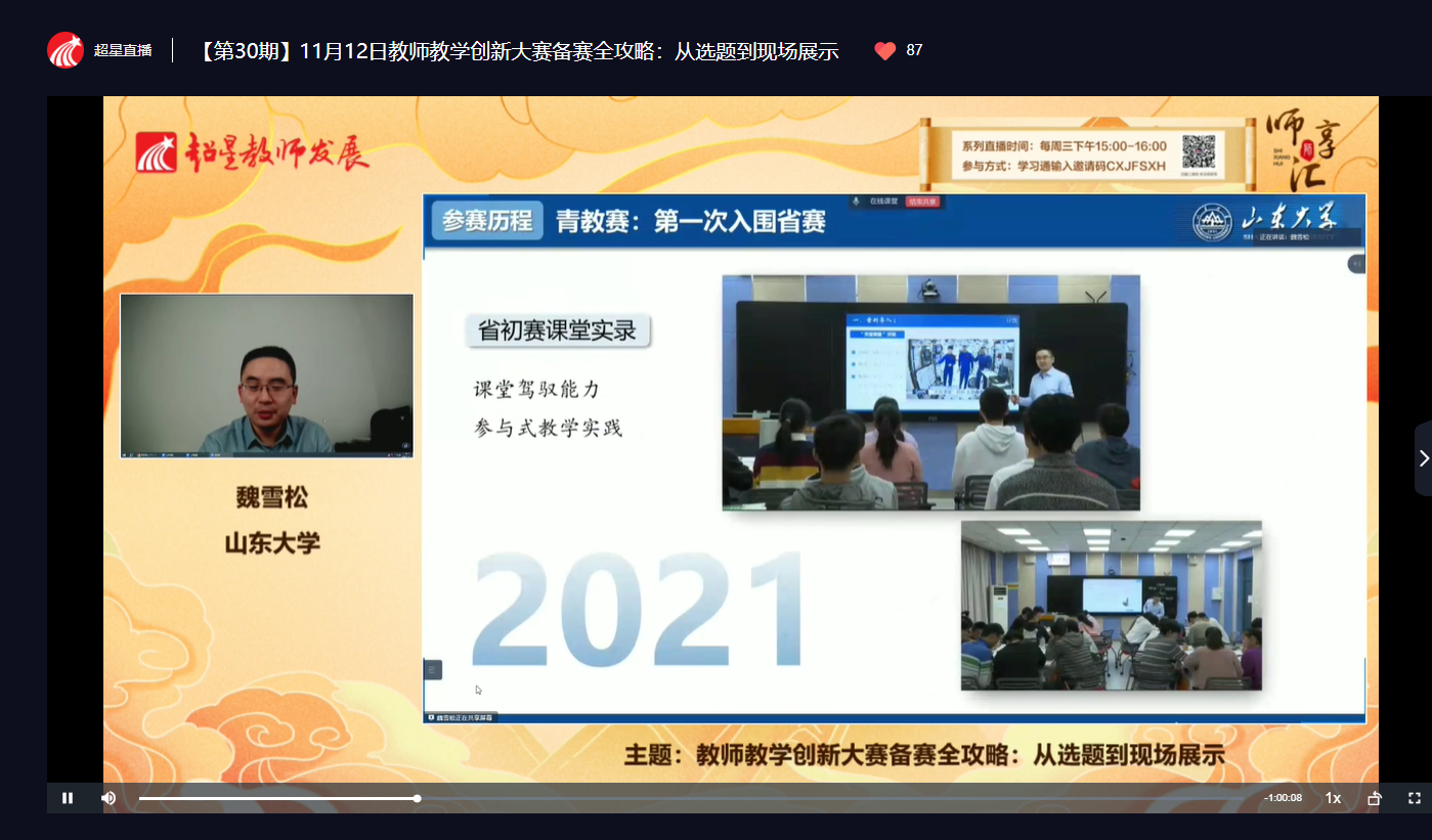为助力教师教学能力提升,积极备战各级教学创新大赛,11月12日下午,学校教师教学发展中心组织全校无课教师齐聚“云端”,参加了超星【师享汇】第三十期网上直播讲座。
