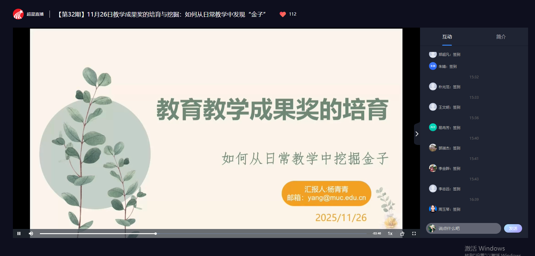 整场讲座逻辑清晰、案例生动,既有理论高度,又极具实践指导意义。与会教师们通过线上平台积极参与,认真聆听,并在互动环节踊跃提问,气氛热烈。大家纷纷表示,杨青青的分享如同打开了一扇新的窗口,不仅增强了对教学成果奖申报的理解与认识,更学到了如何以研究的视角审视和提升日常教学工作,受益匪浅。