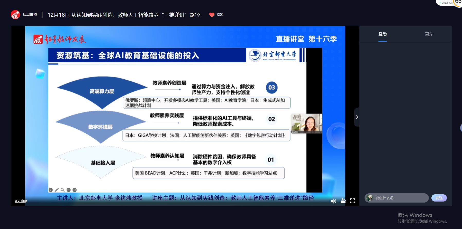 12月18日下午,学校教师教学发展中心组织全校无课教师参加超星教师发展直播讲堂第十六季第十三期线上讲座。本期讲座特邀北京邮电大学张钫炜教授,围绕教师人工智能素养提升作专题报告。