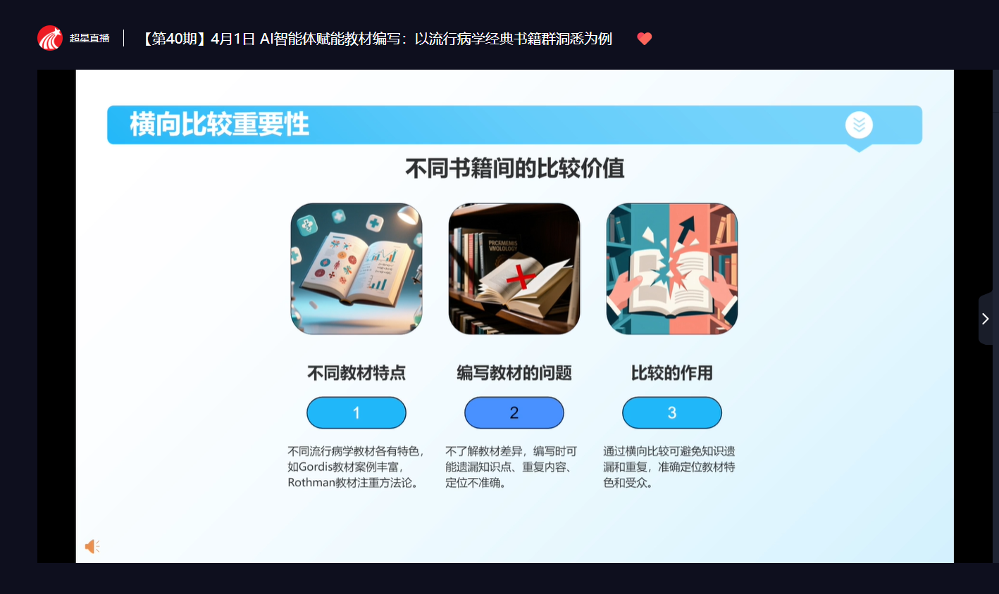 4月1日下午,学校教师教学发展中心组织全校无课教师参加了超星【师享汇】第四十期线上直播讲堂。本次活动特邀北京大学全国医学教育发展中心副研究员江哲涵担任主讲嘉宾,以“流行病学经典书籍群洞悉为例,分享智能体赋能教材编写”为主题,为全校教师带来了一场兼具学术深度与前瞻视野的精彩报告。
