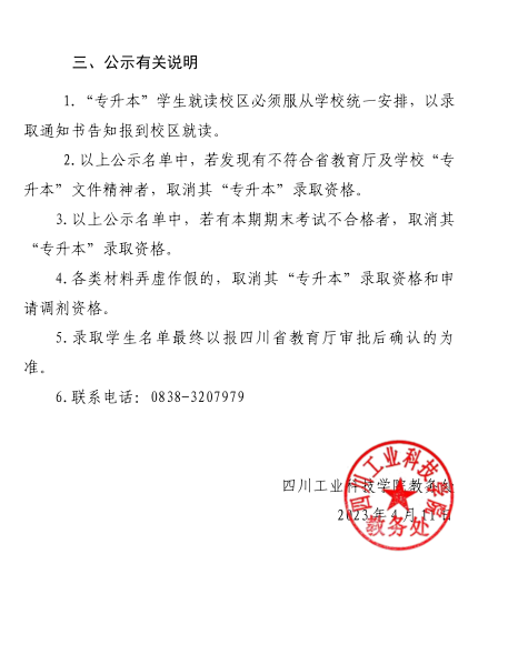 四川工业科技学院2023年专升本调剂录取西华大学退役大学生士兵拟录取学生名单公示