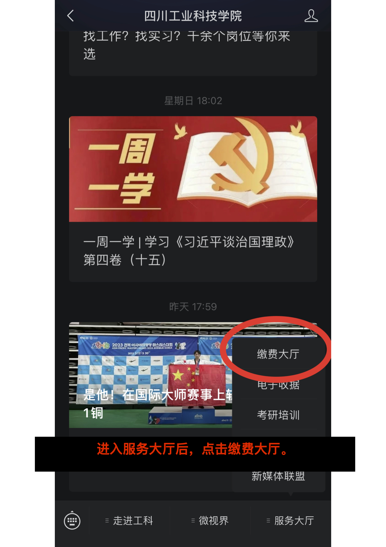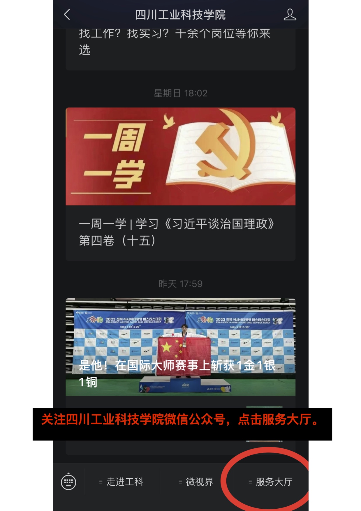 凡我校报考了学前教育、汽车服务工程和体育教育专业毕业论文的自考生,请按照下图流程在“四川工业科技学院微信公众平台”完成论文指导费用缴纳并加入论文QQ群,同时将缴费成功的截图发送至邮箱:439285711@qq.com。注:其他专业自考生论文指导缴费另行通知,报考实践课程不缴费。