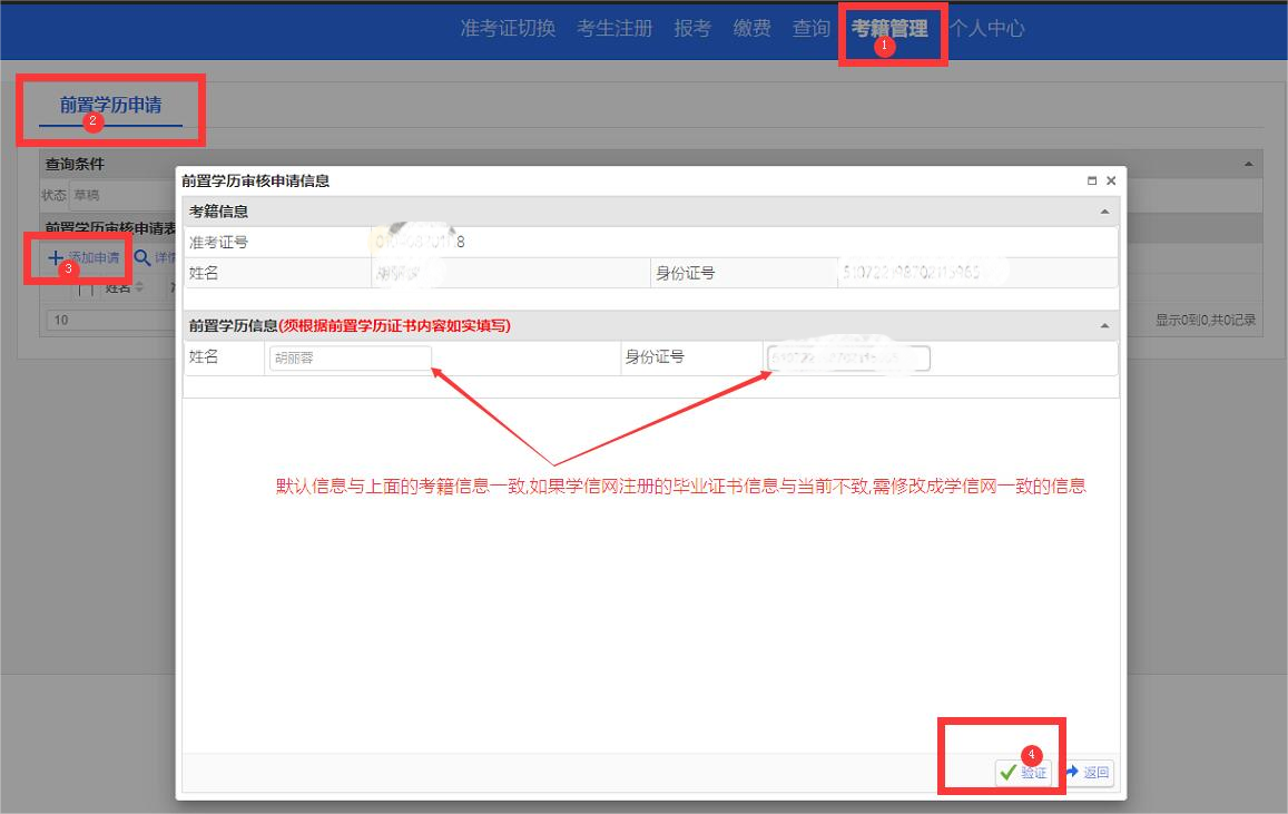 特别提醒:前置学历初始信息(姓名和身份证号)为考生的自学考试考籍信息,考生应先确认该信息是否与实际的前置学历信息一致(以前置学历在学信网上注册的信息为准),若不一致需先修改正确。