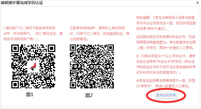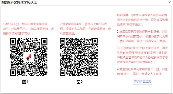 第三步:下载安装学信网APP(学信网APP下载链接:https://www.chsi.com.cn/wap/download.jsp),或考生用手机扫描上图1“学信网APP”二维码后安装并登录,再点击“学信网APP”右上角扫描上图2“二维码”,出现以下界面(如果输入信息在学信网找不到对应数据,将不会出现下图界面)。