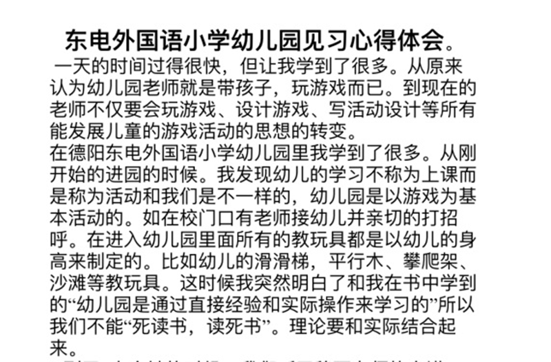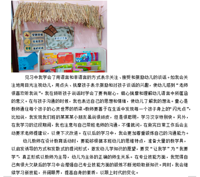 现见习已过半,同学们颇有感触,每次见习结束后同学们会把自己在幼儿园的所见所感写成心得体会,在他们的心得体会中大部分同学都描述到自己是初次近距离接触到幼儿园教育教学,激动、紧张、兴奋、好奇等各种情绪充斥着他们,当然还有一些小小的紧张,使得他们心里五味杂陈。在见习的过程中也遇到了很多的问题,例如学生朵易在见习的过程中遇见小朋友在她面前大哭,她感到手足无措不知如何处理,在老师的协助下安抚了小朋友的情绪;程芮在第一次给小朋友讲故事时很胆怯,经过老师的鼓励终于鼓起勇气讲了“灰灰走丢了”的故事,学生王超在见习过程中对幼儿的意外答案和突发行为及语言,不能迅速且灵活的应答和处理。