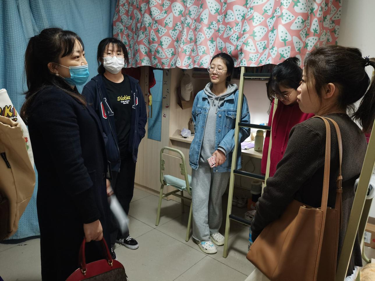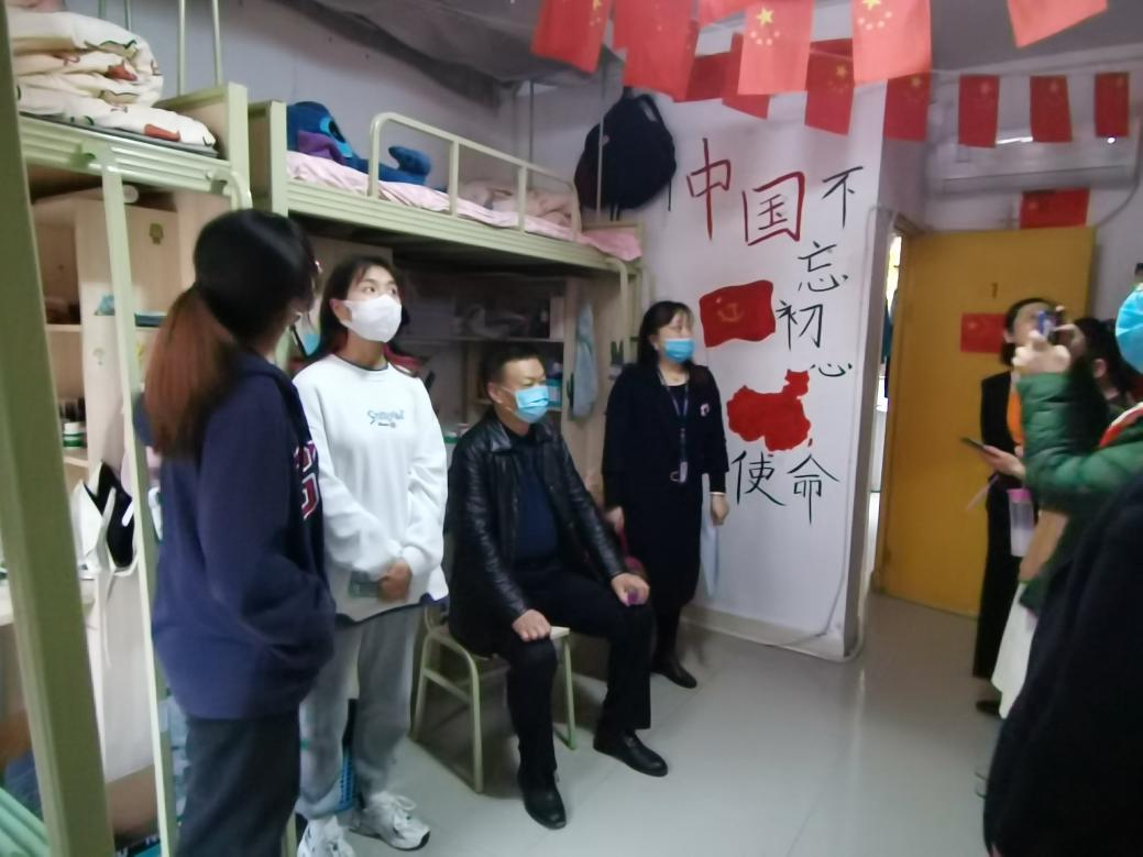 院领导和老师们依次亲切地慰问同学们的生活和学习情况,同时也暖心提醒同学注意寝室用电安全,参观了同学们的寝室文化建设。学院领导建议让大家充分利用学前教育的特色,将绘画作品、手工作品、书法作品粘贴在墙上,让寝室文化更加丰富,让寝室更加有家的感觉。