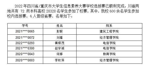 为全面落实立德树人根本任务,切实提高大学生创新精神和信息素养能力,2022年四川省/重庆市大学生信息素养大赛(以下简称“大赛”)初赛于10月22日如期举行。教育学院近60名学子在曾雪老师的指导下,积极备赛,最终我院20级学前教育4班何婷同学、21级小学教育15班谢明利同学在我校600多名参赛学子中突出重围,代表四川工业科技学院参加省赛。
