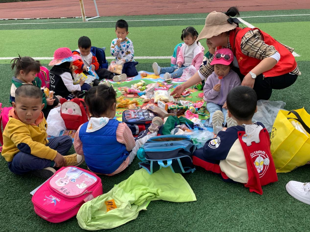 参观完实训室后,为了培养孩子与人交往、与人分享的意识,增进孩子间的情谊,同时让学前教育专业的同学更近距离地观察、分析小朋友们的行为习惯,黄译漫老师又带领着小朋友们到操场上开展了零食分享会。在老师给小朋友们讲解了注意事项以及食品安全知识后,大家开始选位置、铺垫子、摆放零食和水果,小朋友们围成一个圈坐在垫子上,一边分享着美食,一边与小伙伴聊着最近发生的趣事,享受着美好的时光,脸上洋溢着阳光灿烂的笑容。充满着欢声笑语的零食分享会,让春光明媚的大学操场满溢着露营和野餐的氛围。