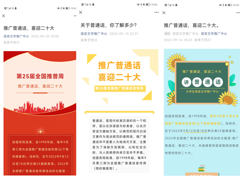 为使推普活动全面、深入开展起来,学校教学楼贴上了宣传标识牌、摆放了“推普”展板、制作了“推普”黑板报。学校还充分利用微信公众号、微博、官网、抖音等新媒体开展活动,让本次“推普”宣传活动在我校全方位覆盖。