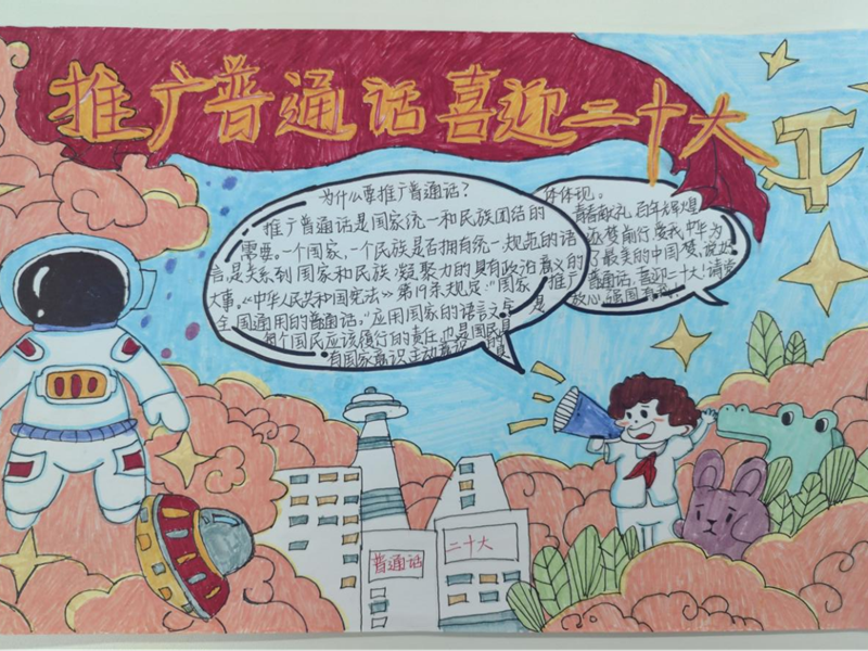为全面贯彻国家语言文字法律法规和方针政策,积极引导全校师生树立科学的语言观,增强师生说好普通话,写好规范字的意识,提高师生国家通用语言文字的应用能力,积极营造喜迎党的二十大胜利召开的浓厚氛围,全国第25届推广普通话宣传周期间,我校开展了以“推广普通话 喜迎二十大”为主题的推普周系列活动,让“说普通话,写规范字”在校园内蔚然成风。