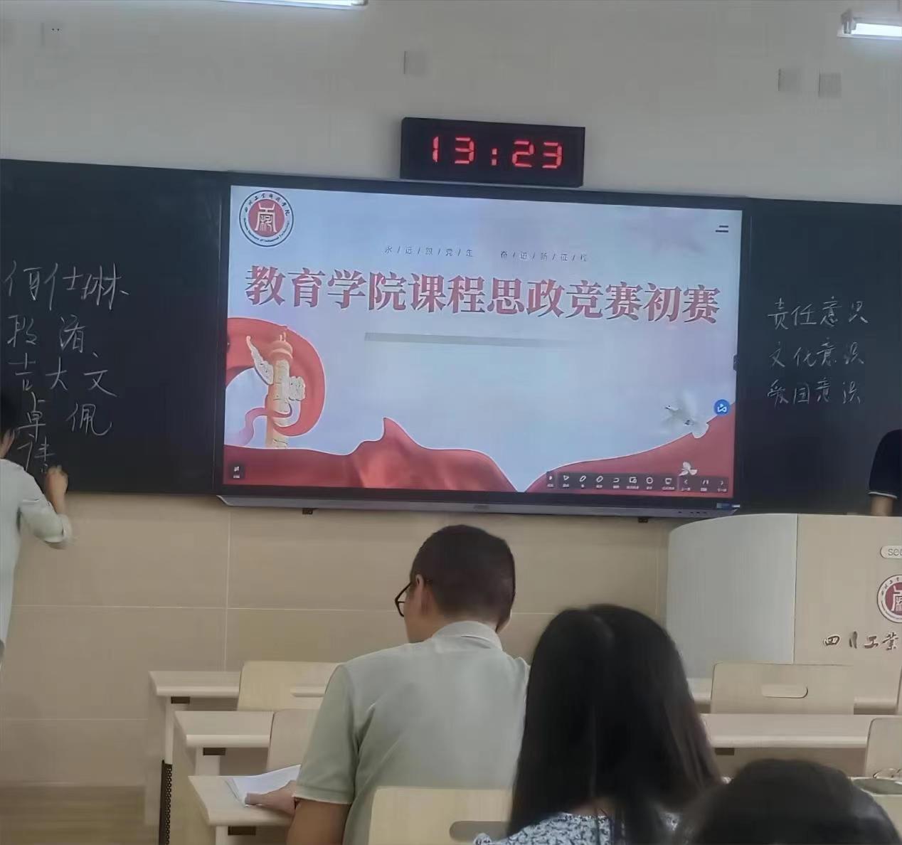 为深入贯彻落实习近平总书记关于教育的重要论述和全国教育大会,中共中央办公厅、国务院办公厅《关于深化新时代学校思想政治理论课改革创新的若干意见》、教育部《高等学校课程思政建设指导纲要》精神,把思想政治教育贯穿人才培养体系,全面推进学校课程思政建设,发挥好每门课程的育人作用,提高人才培养质量。教育学院于2023年9月14日在龑江学村B405教室举办了“课程思政”教学竞赛初赛。