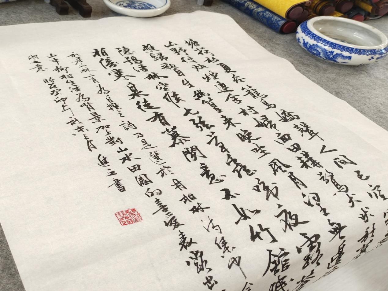 比赛开始,各参赛选手在工作人员的组织下按软笔和硬笔两个书写区有序就坐,随即进行书法创作。