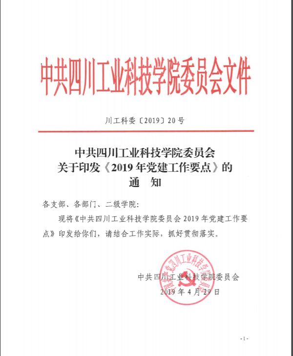 中共四川工业科技学院委员会关于印发《2019年党建工作要点》的通知。