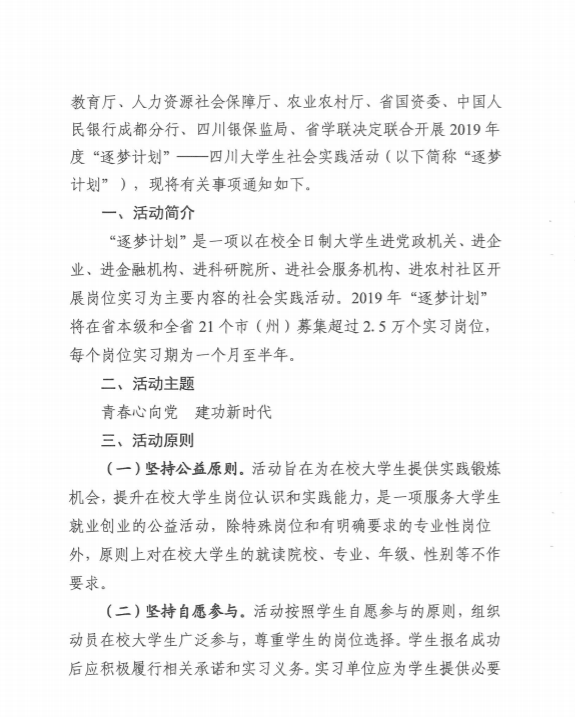 关于开展2019年度"逐梦计划”四川大学生社会实践活动的通知。