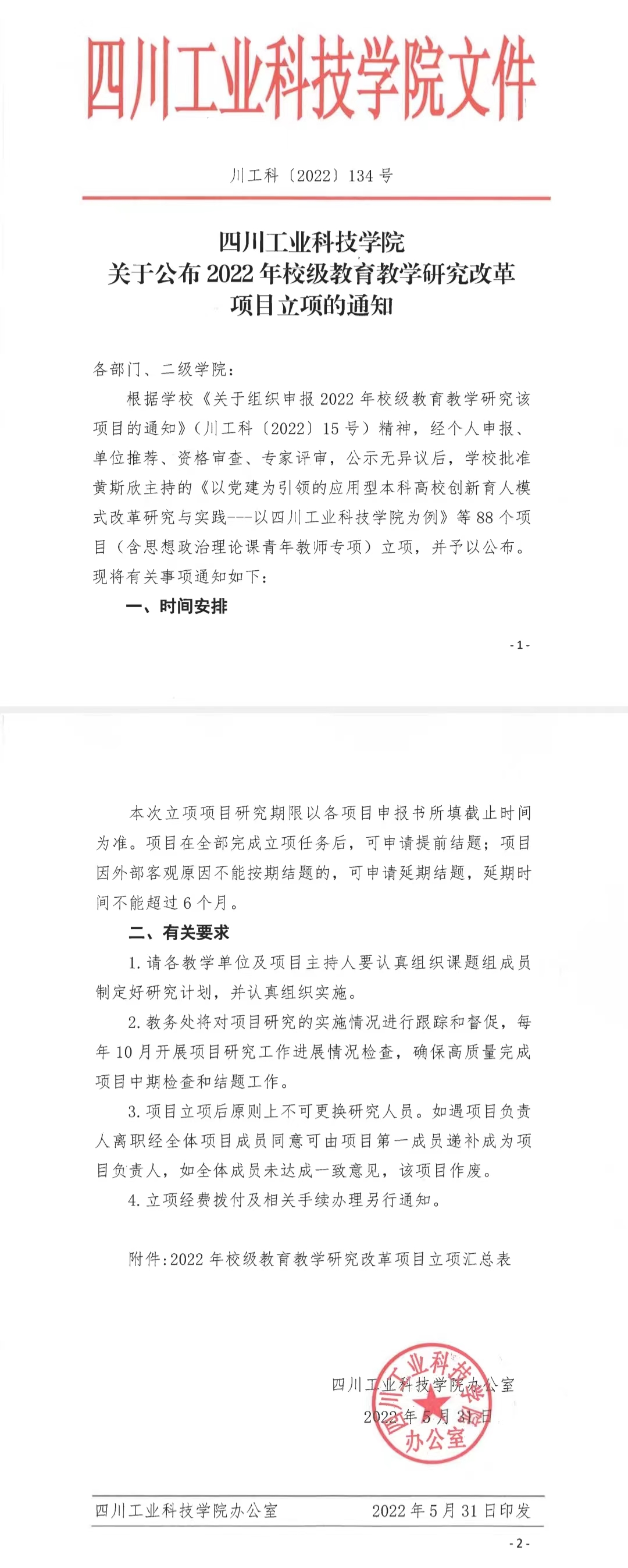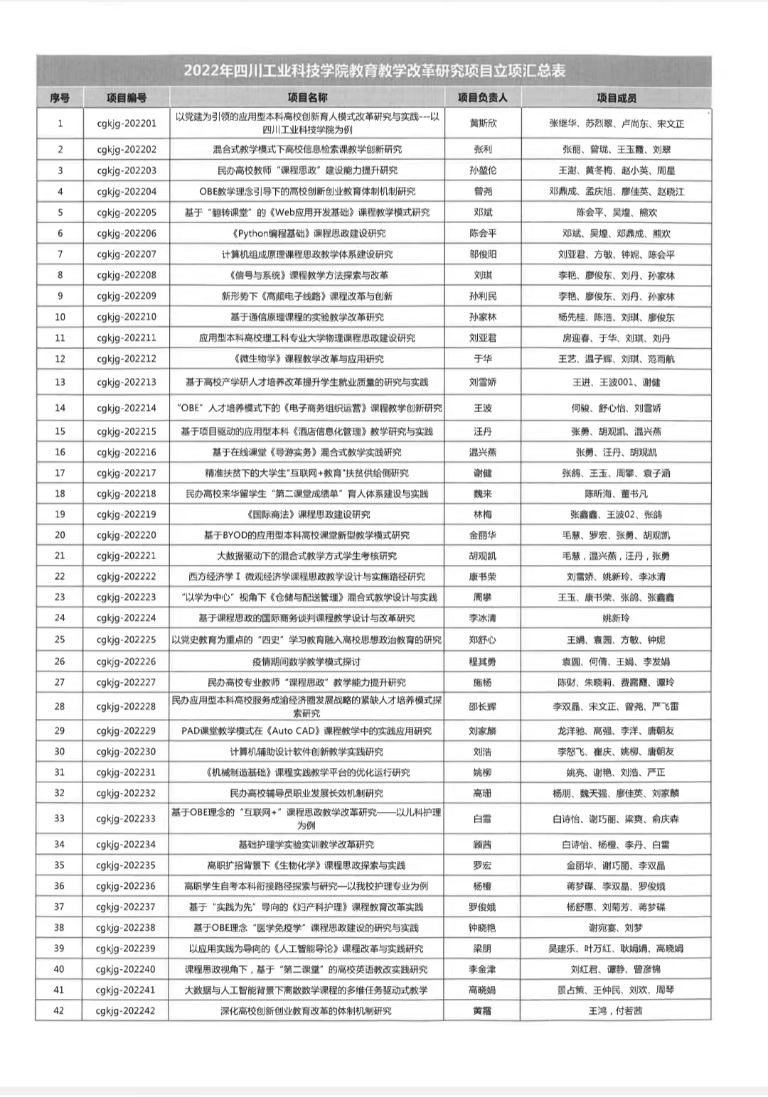 四川工业科技学院关于公布2022年校级教育教学研究改革项目立项的通知