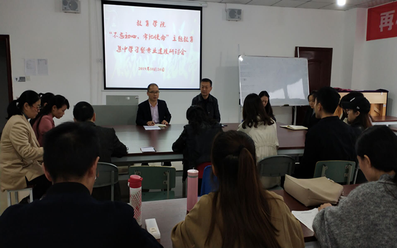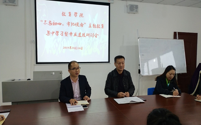 10月24日下午,教育学院在学前教育实训中心召开“不忘初心,牢记使命”主题教育集中学习暨专业建设研讨会,学院院长吴节义、支部书记熊定永、副院长孙红英及学院全体教职工参加会议。会议主要内容是结合“不忘初心、牢记使命”主题教育集中学习,探讨学院专业建设及常规管理,促进工作水平整体提升。
