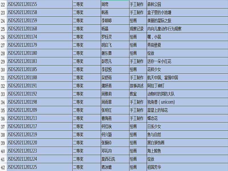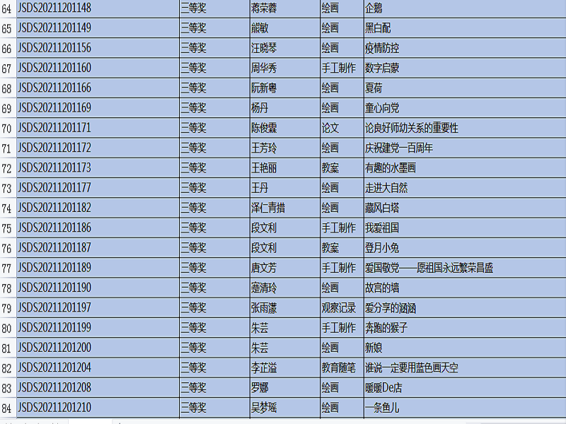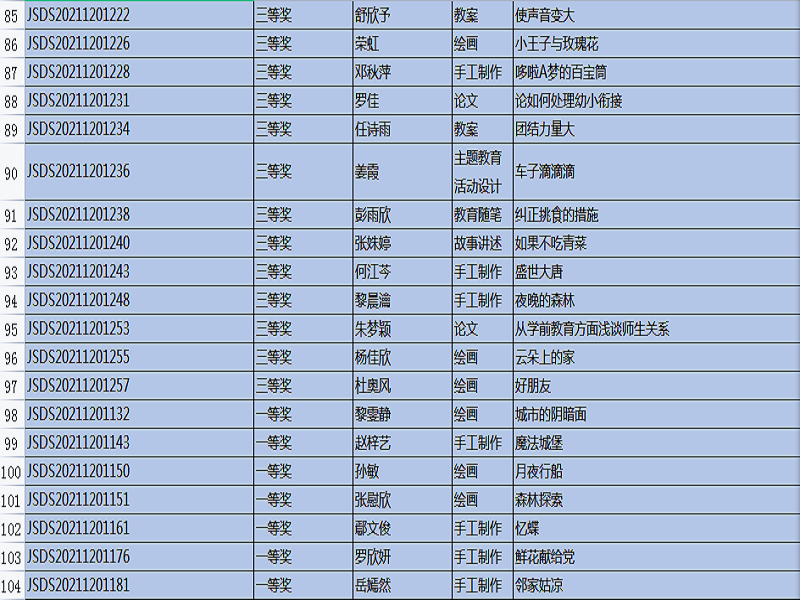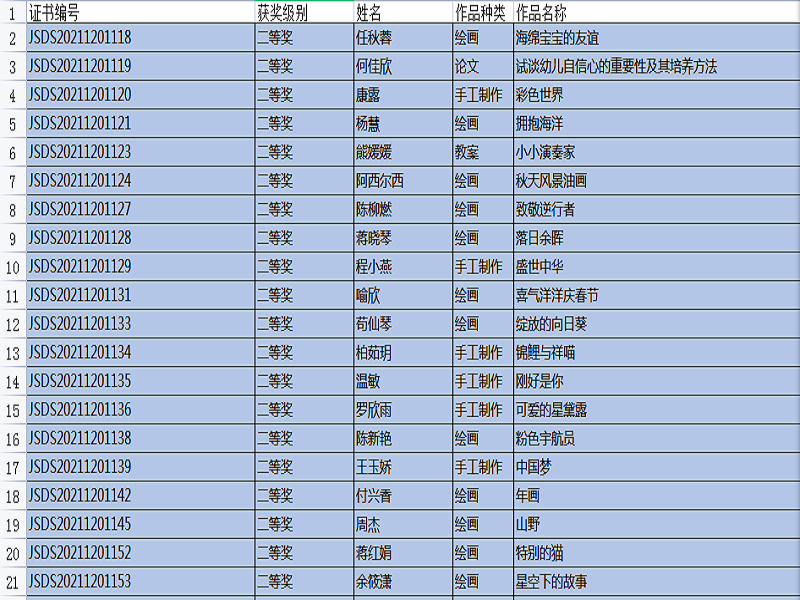 “全国幼儿教师职业技能大赛”,是幼儿教师培养工作的重要组成部分,是促进教育质量提高的重要途径,是教师分享、交流、进步的平台,也是教师完善自我、提升自我、超越自我的体现。本次比赛主题是:创新,源于对教育的感悟,比赛时间从9月开始一直延续到11月中旬结束,比赛项目有: 教案、说课稿、教育随笔、观察记录、案例分析、论文、半日活动设计、主题教育活动设计、手工制作、绘画、故事讲述、手指游戏,共12项。在1220号刚刚公布的成绩中,我院学生通过激烈的竞争和角逐,所有参赛作品均获奖。其中,一等奖20份,二等奖51份,三等奖45份,优秀奖35份。本次技能大赛的硕果累累,增加了教师之间的专业交流,促进了幼儿教师的职业素养,更好地践行了《纲要》和《指南》精神,也对我院学前教育专业的教学质量交上了一份满意的答卷。