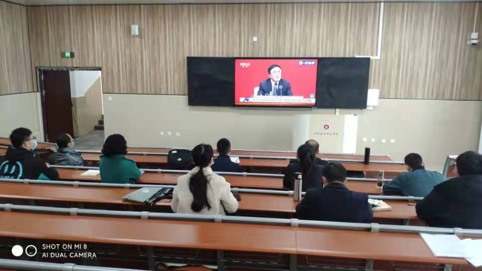 11月12日上午十点,马院全体老师在龑江校区b-212集体收看十九届六中全会新闻发布会直播。