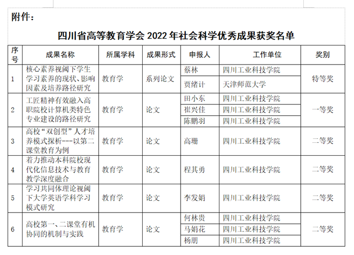 经网络评审、会议评审、评选结果公示等环节,最终评选出2022年四川省高等教育学会社会科学优秀成果奖51项,其中特等奖5项、一等奖17项、二等奖29项。我校荣获特等奖1项,一等奖1项,二等奖4项。