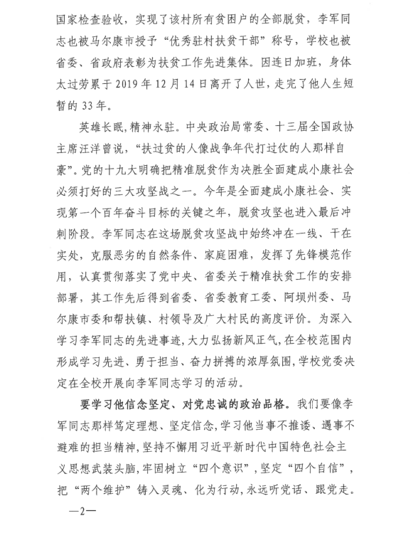 中共四川工业科技学院委员会关于开展向我校优秀驻村扶贫干部李军同志学习的决定