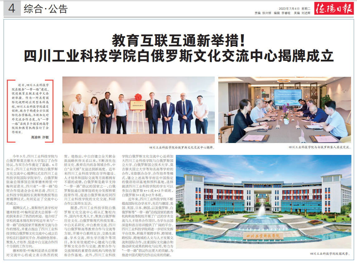 【德阳日报】四川工业科技学院白俄罗斯文化交流中心揭牌成立