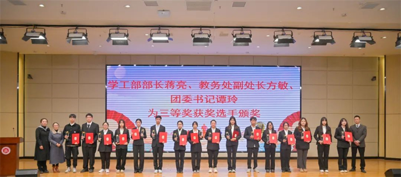 学工部部长蒋亮、教务处副处长方敏、团委书记谭玲为三等奖获奖选手颁奖。