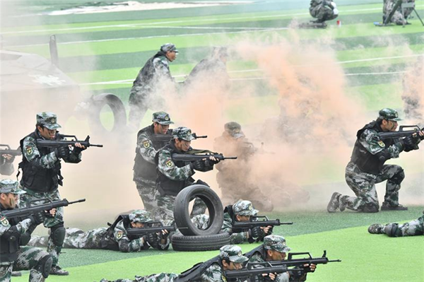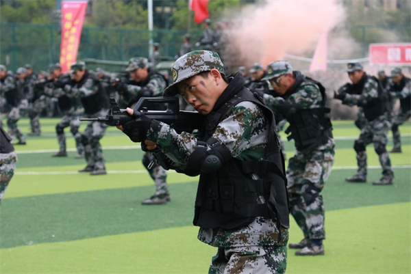 在战术方队的表演中,仿真陆战车、迫击炮、火箭炮、烟雾弹等齐登场,这些硬核装备瞬间将操场变身成“战场”,表演方阵通过展示队形变换、擒拿格斗、反恐突击等,展现新生们顽强拼搏,敢于挑战极限的意志和捍卫祖国和平与安宁的豪情壮志。