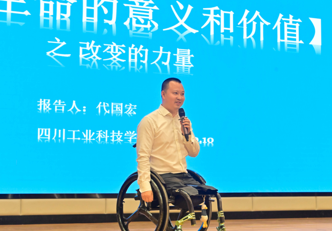 10月10日,四川残疾人励志报告团走进四川工业科技学院开展“弘扬正能量、奋进新征程”主题励志宣讲活动。报告团成员代国宏、粟秋滔、杨洲等受邀作精彩宣讲,为学校300余名师生带来了一场生动鲜活、感人至深的生命教育课、励志思政课。